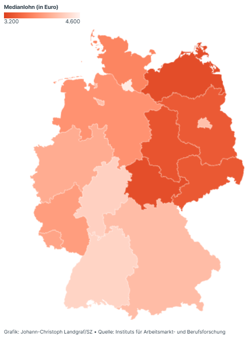 Die Karte zeigt den Medianlohn in allen deutschen Bundeländern im Jahr 2024.