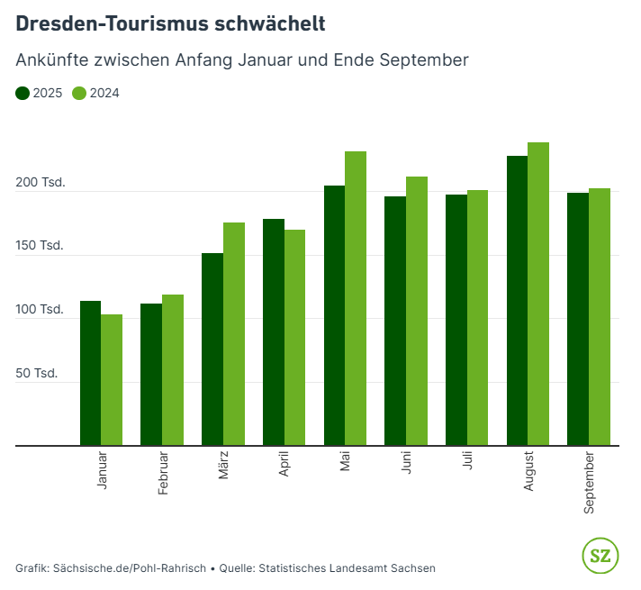 Dresden. Dresden tut sich 2025 schwer damit, so viele Touristen in die Stadt zu locken wie im vergangenen Jahr. In den ersten neun Monaten reisten rund 1,58 Millionen Übernachtungsgäste nach Dresden und damit fünf Prozent weniger als im selben Zeitraum des Vorjahres. Die Zahl der Übernachtungen schrumpfte um zwei Prozent auf 3,31 Millionen. Das geht aus den neusten Zahlen des Statistischen Landesamtes hervor.