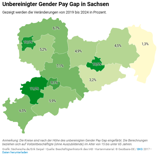 Damit ist die Verdienstlücke im Vergleich zu 2024 um weitere 0,7 Prozentpunkte gesunken. Das Institut für Arbeitsmarkt- und Berufsforschung (IAB) hatte schon Anfang der Woche eine aktuelle, ausführliche Studie zur Entwicklung der regionalen Verdienstlücken veröffentlicht, allerdings auf der Zahlenbasis bis 2024. Danach lag der unbereinigte Gender Pay Gap im Vorjahr bei 6,7 Prozent. Bereinigt um strukturelle Unterschiede wie Teilzeit, Berufswahl, Karrierelevel und Erwerbsbiografie bleibt jedoch auch in Sachsen eine Lohnlücke von 9,9 Prozent.
