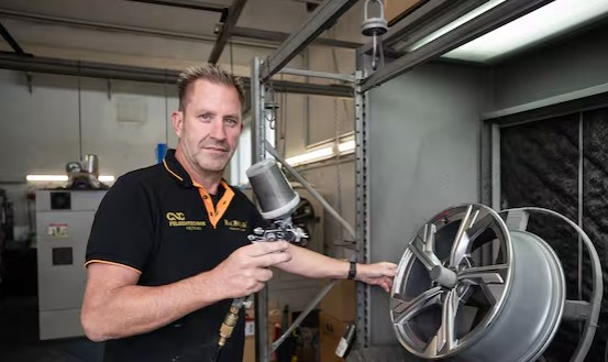 „Mit hat diese Arbeit hier auch einfach immer den meisten Spaß gemacht.“ Das merkt man, wenn Wolfgang Fietkau erklärt, was er eigentlich tut: Erster Schritt für die Felgen, die es zu erneuern gilt: Der alte Lack muss runter, in einem chemischen Bad. Danach geht es weiter in einer Glasperlen-Strahlanlage. „Das ist wie eine Tiefenreinigung.” Glänzend kommen die Aluminiumfelgen heraus. Danach gleichen Fietkau und seine beiden Mitarbeiter Schäden aus. „Oftmals sind es Bordsteinschäden”, manchmal muss eine Felge gerichtet werden, wenn eine Unwucht besteht.
